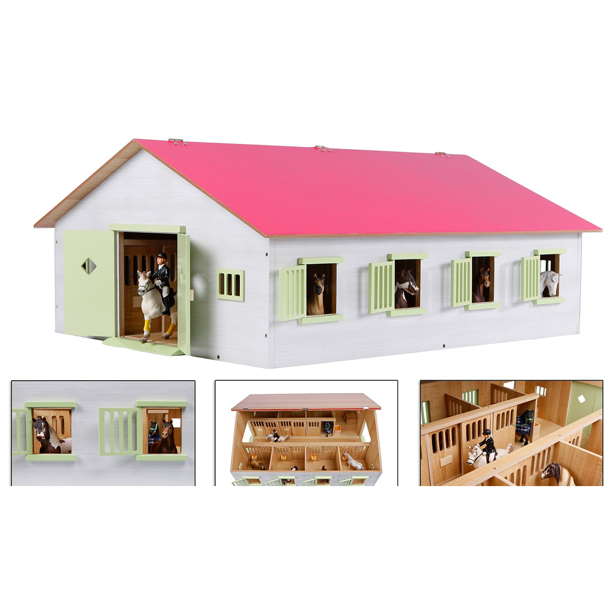 Pferdestall rosa aus Holz 1:24 mit 7 Boxen für Pferde, 72.5x60x30cm, Zubehör nicht im Lieferumfang enthalten.
