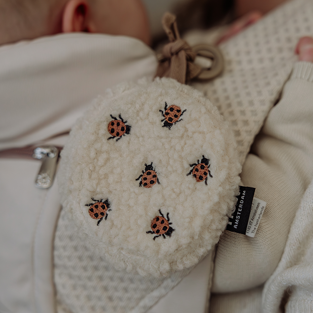 Der Comforter on the go ist eine kleinere Version, die Sie unterwegs mitnehmen können. Dieser Comforter mit Herzschlag gibt Ihrem Kind ein sicheres und beruhigendes Gefühl auf der Straße. Sie können den Comforter ganz einfach mit einem Band am Maxi Cosi oder Kinderwagen befestigen. Der Comfrorter wird mit einer Musikbox geliefert, die 2 Geräusche abspielt: Herzschlag und weißes Rauschen. Mit einem großen Knopf können Sie die Musikbox einschalten, die Lautstärke anpassen und zwischen den beiden Geräuschen umschalten. Da der Knopf extra groß ist, lässt sich die Musikbox auch leicht bedienen.