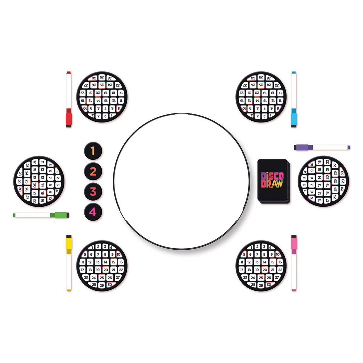 Disco Draw - wer hat den Dreh raus? Ein lustiges Partyspiel, das alle mit einfachen Zeichnungen auf die Probe stellt. Die Spieler zeichnen gleichzeitig auf einer sich drehenden Tafel. Das Zeichnen ist schwierig, das Erraten macht Spass. Für jede richtige Zeichnung erhält der Spieler einen Punkt, ebenso wie der Künstler, der sie gezeichnet hat. Es gewinnt, wer die meisten Punkte erzielt.
