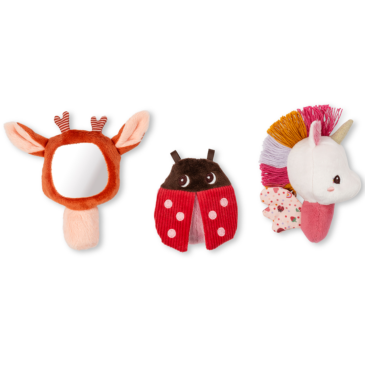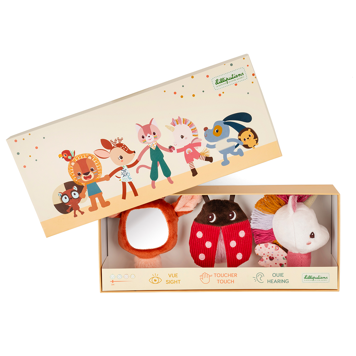 Geben Sie Ihrem Baby diese ersten sensorischen Spielzeuge! Dieses Set aus 3 Stoffrasseln ist ab der Geburt geeignet: ein ideales Geschenk, das die Sinne weckt und die Neugier der Kleinen weckt. Diese sensorischen Spielzeuge werden in einer hübsch illustrierten Schachtel präsentiert und stimulieren drei Sinne: Sehen, Tasten und Hören. Suchen Sie dazu: Lena, das Einhorn, und ihre brennenden Flügel, die ein lustiges Rascheln erzeugen, Stella, das Rehkitz, und ihre weichen Ohren mit ihrem kleinen Spiegel, um sich selbst zu beobachten und ein runder Marienkäfer, der mehrere Texturen bietet, die Sie mit Ihren Fingerspitzen entdecken können. Auch dieses weiche und farbenfrohe Trio ist mit originellen Mustern verziert. Das sind Babys erste Freunde! Mit diesen Plüschtierrasseln lernt Ihr Kind, neugierig zu sein und die Welt in seinem eigenen Tempo zu entdecken. Ihre Form ist auf eine einfache Handhabung durch die Kleinen ausgelegt. Hier ist eine tolle Geschenkidee für die Kleinen, in einer Box mit unserer fröhlichen Lilliputiens-Bande, die sicher die ganze Familie begeistern wird! Willkommen Baby, willkommen Lena und Freunde! Material: Polyester.