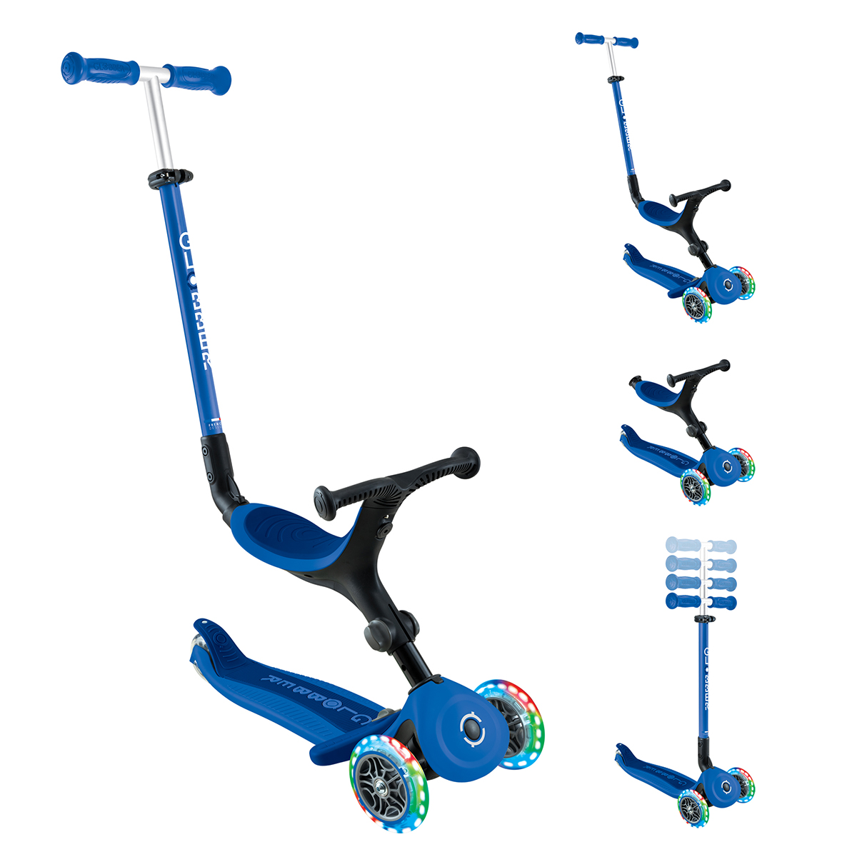 All-in-one-Produkt, das sich weiterentwickeln lässt: Tragehilfe, freistehende Draisine und faltbarer Roller. Dieser All-in-One-Roller mit abnehmbarem Sitz lässt sich ganz einfach in drei verschiedene Produkte umwandeln, während Ihr Kind lernt und wächst! Zwei 121 mm große Vorderräder (gelagert auf auf ABEC 5 Lagern) von hoher Qualität und mit hoher Elastizität blinken rot, grün und grün. blau dank des im Kern integrierten Dynamos für leuchtende Spaziergänge! Der in 2 Höhen verstellbare Sitz passt sich an, um Ihrem Kind mehr Platz zu geben, wenn es wie es wächst. Der in 4 Stufen verstellbare T-Bar-Lenker. Positionen ist mit einer stabilen Klemme ausgestattet. und TPR-Griffen für maximalen Komfort ausgestattet.