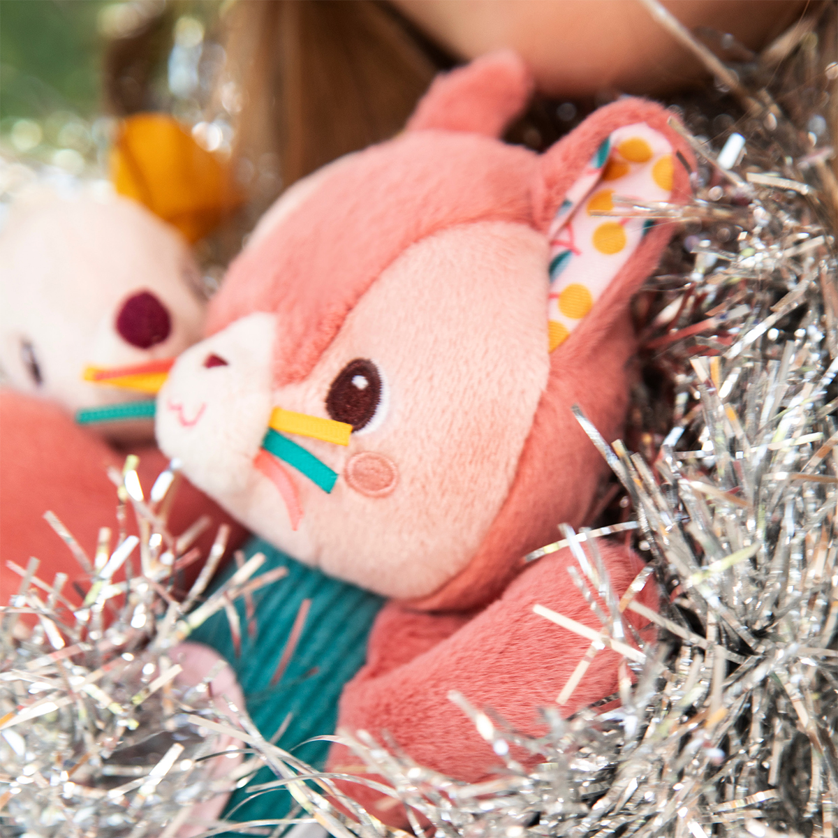 Zeit, mit der Jeanne-Puppe zu spielen! Diese kleine Fingerpuppe ist ideal, um Babys ab 6 Monaten zu unterhalten. Mit seiner praktischen Größe passt es in jede Tasche und erwacht wie von Zauberhand zum Leben – zur Freude der Kleinen! Dazu einfach mit den Fingern durch die beiden Arme der Puppe fahren und schon kann es losgehen ins Abenteuer. Mit dieser Plüschpuppe können Sie auch Lieder, Kinderreime und andere Geschichten Ihres Kindes zum Leben erwecken. Aber das ist noch nicht alles! Diese Lilliputiens-Handpuppe bietet 3 Aktivitäten, um die Sinne Ihres Kleinen zu unterhalten und zu stimulieren. Erstens eine Rassel an Jeannes Kopf, die fröhlich klingelt, wenn Sie sie bewegen. Dann ermöglicht ein runder Spiegel auf seinem Bauch Ihrem Kleinen, sich selbst zu bewundern. Und das Beste kommt natürlich zum Schluss: Die lustige kleine Maus, Jeannes beste Freundin, knistert vor Raschelpapier. Diese Plüschpuppe ist daher ein ideales Lernspielzeug, um das Seh- und Hörvermögen des Babys, aber auch seine Motorik und Vorstellungskraft zu fördern. Wir lieben die hübschen Kirschabdrücke, die kleinen Schnurrhaare und die langen, weichen Beine unserer Gartenkatze! Dieses Spielzeug für das erste Lebensjahr können Sie bei 30° in der Maschine waschen.