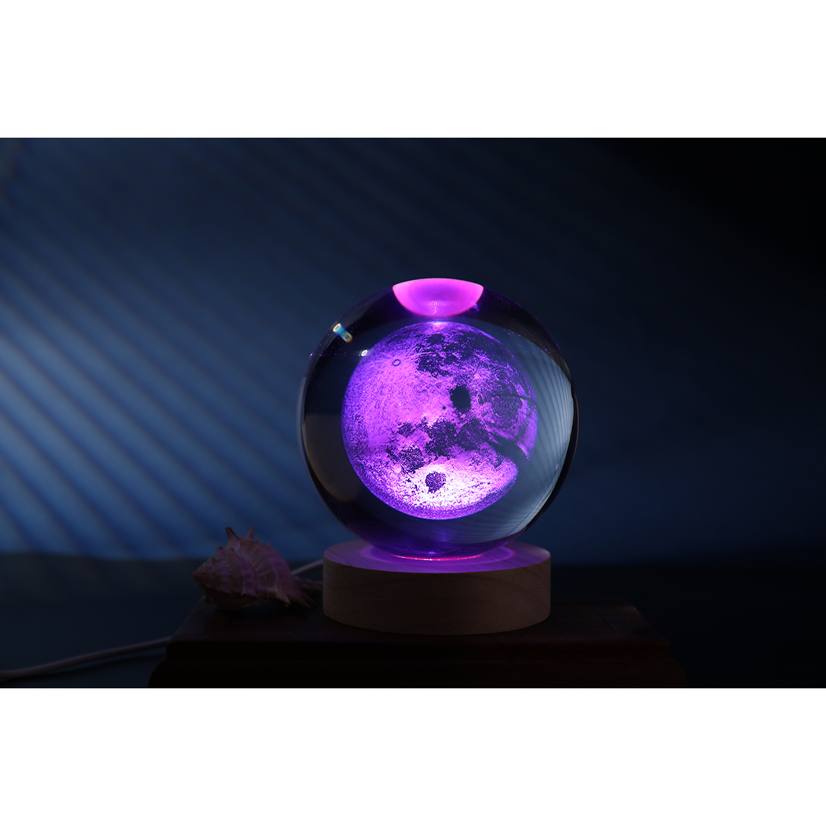Diese Kristallkugel eignet sich als dekorative Lampe für Wohnräume und trägt zu einer stimmungsvollen Atmosphäre bei. Der Sockel ist aus Eichenholz gefertigt. Sie kann als Nachttischlampe oder Nachtlicht verwendet werden. Die Innenseite der Kristallkugel ist mit eleganten und klaren Mustern graviert.