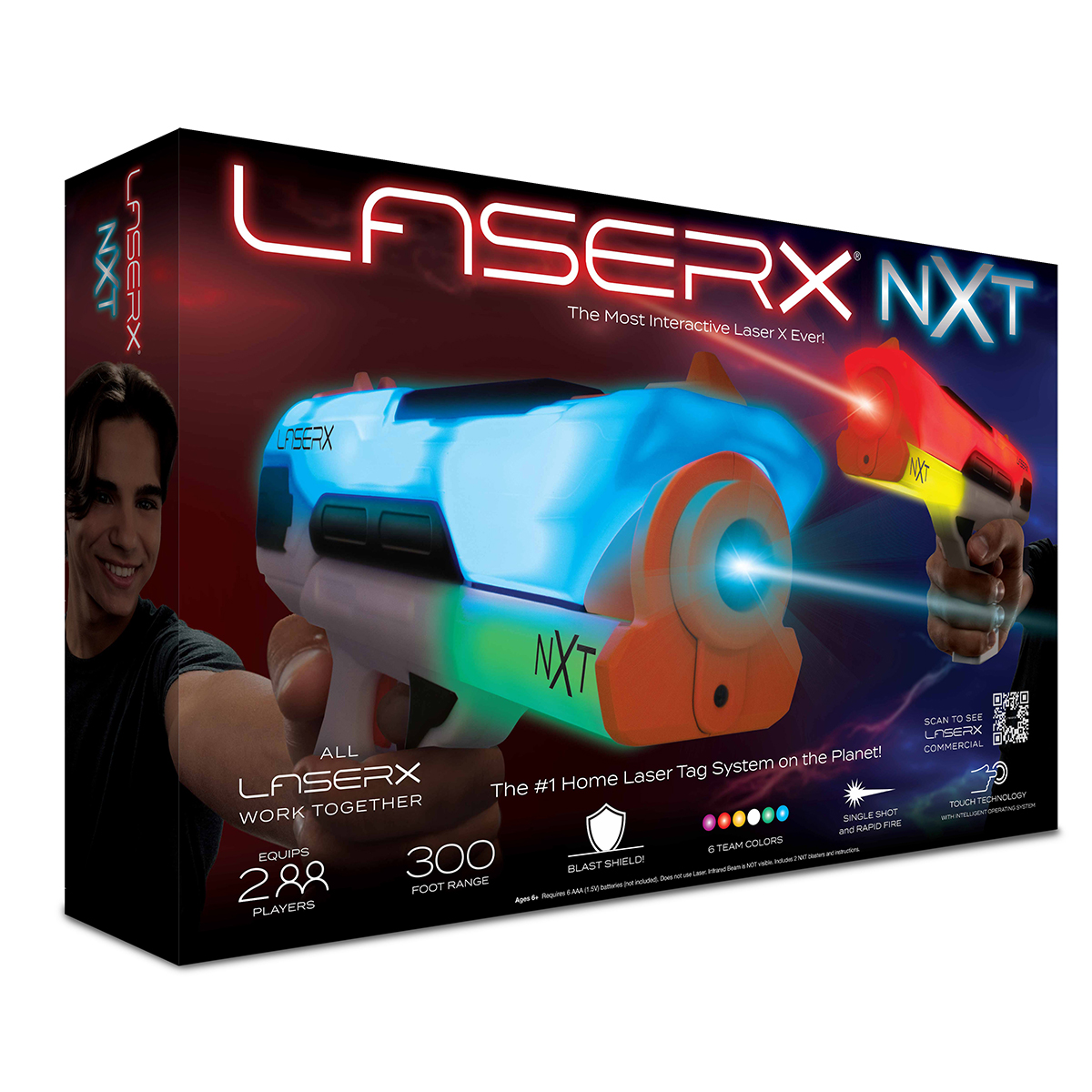 NXT kombiniert die von LaserX gewohnte Leistung und Benutzerfreundlichkeit mit einer brandneuen, intuitiven Benutzeroberfläche - keine Knöpfe oder Schalter - nur Wischbewegungen. Bis zu 90 Meter Reichweite. NXT-Blaster erwachen zum Leben und zeigen visuell alle Status an Anzeigen für Einzel- und Schnellfeuerblasts. 6 Teamfarben. Strahlenschutzschild. Integrierter Hit-Sensor mit Lebensanzeige und visuellem Puls NXT funktioniert mit allen bisher hergestellten Laser X-Blastern.