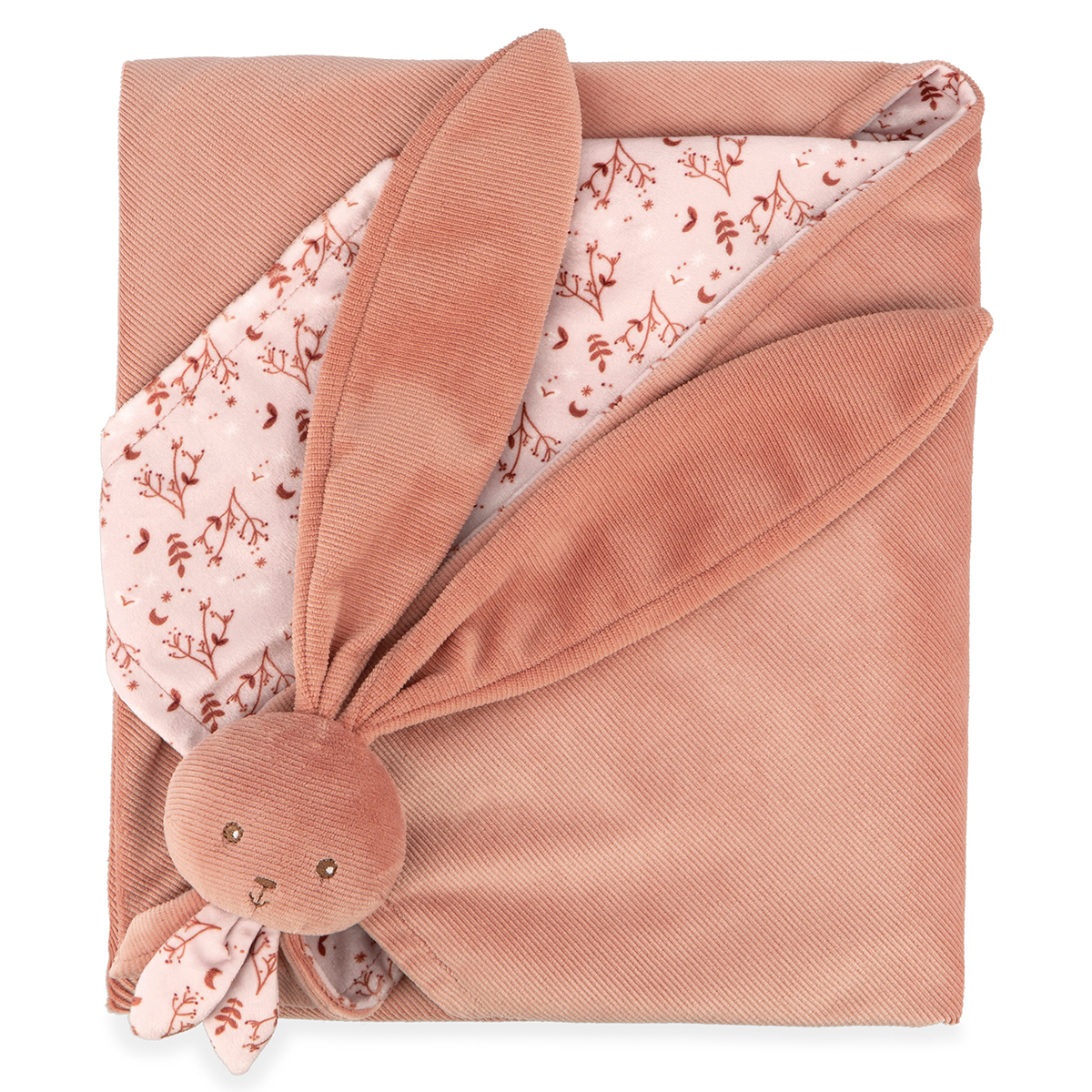 Schenken Sie Baby mit dieser terrakottafarbenen Kuscheldecke Weichheit und Trost. Sie ist mit einem Hasenkopf mit langen Ohren versehen, damit man sie überall aufhängen kann und nie verliert. Die herrlich weichen Stoffe aus Microvelours und Cordsamt machen diese Decke so kuschelig wie eine Umarmung. Die Motive auf einer Seite verleihen der Kuscheldecke einen raffinierten Touch. Sie besteht zu mindestens 90 % aus recycelten Materialien und recyceltem Füllmaterial, was sie zum idealen Geburtsgeschenk für Ihre Lieben macht. 70 x 80 cm. Bei 30 °C in der Maschine waschbar. Ab Geburt.