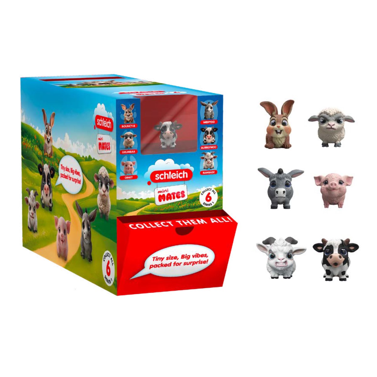 Die neuen schleich® mini MATES sind liebenswerte Tierfiguren im Taschenformat, die eine ganze Gefühlswelt ausdrücken – von fröhlich bis grimmig. Mit ihren grossen Augen und ihrem unwiderstehlichen Charme sind sie perfekt zum Sammeln, Tauschen und Mitnehmen. Schaffst du es, alle sechs Freunde der ersten Serie zu sammeln? 24 Blind Bags in Display.