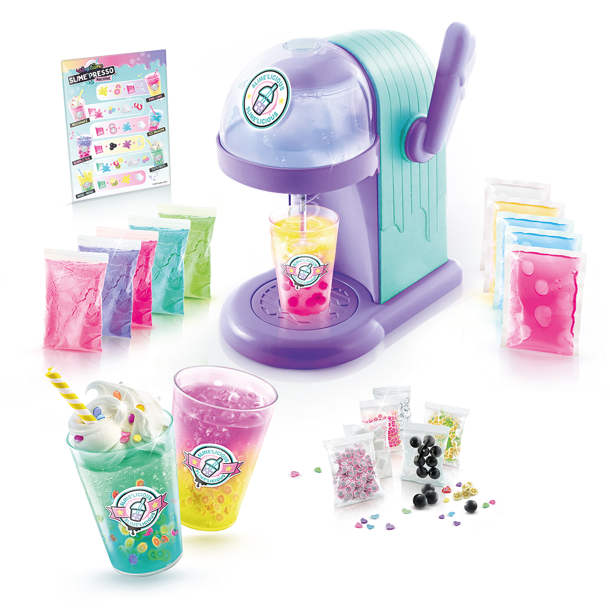 Viel Spaß mit deinem elektronischen Schleimmixer. Ein einzigartiges Design wie eine echte Kaffeemaschine. Benutze ihn, um mehr als 10 Schleimgetränke herzustellen! Folge den Rezeptkarten oder kreiere deine eigenen Getränke aus Schleim. Mische das Schleimpulver mit Wasser, füge die Dekoration hinzu und schon ist der Schleim fertig. Es ist wirklich einfach, etwas Schönes zu machen!