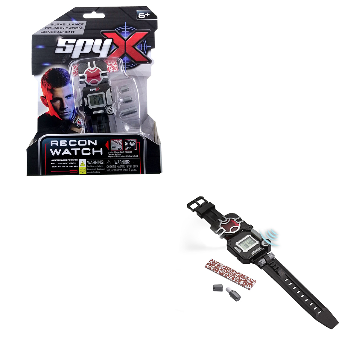 Multifunktions-Uhr mit Nachtsicht, Licht-/Bewegungssensor, 2 Nachrichtencapseln und Spionagepapier, CR2023 (nicht enthalten). Ab 3 Jahren.