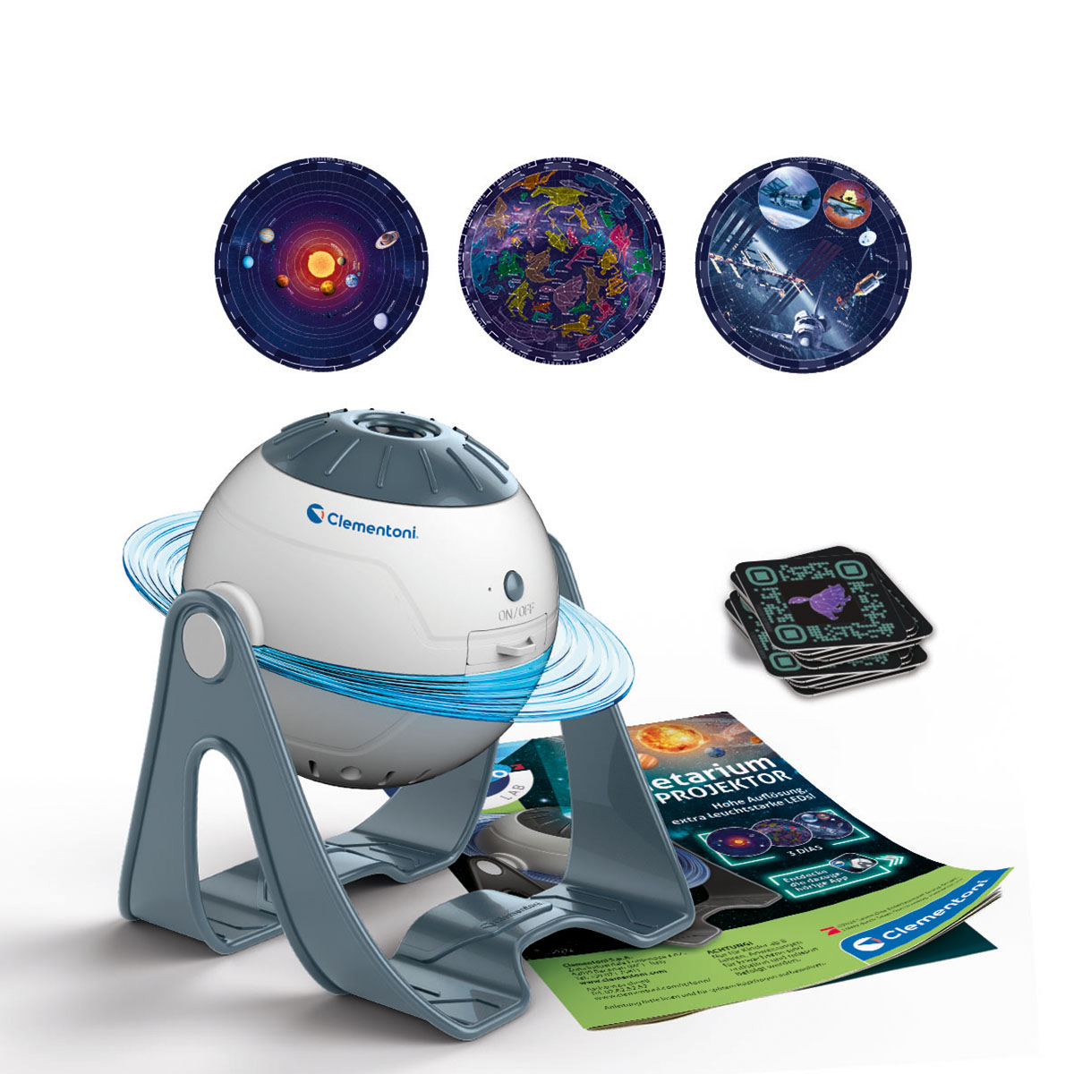 Sternen-Projektor. Ein Planetarium zur Beobachtung der Planeten, Sterne und Konstellationen, die direkt an die Wand projiziert werden! Das Produkt enthält verschiedene Bilder, die projiziert werden können. Mit der App kann man auf Quizfragen zugreifen, die Geschichte des Universums hören und die Sternbilder und Planeten in Augmented Reality ansehen. Entwickelt, um auf innovative und unterhaltsame Weise etwas über Astronomie zu lernen! In Italien entwickelt und gestaltet.