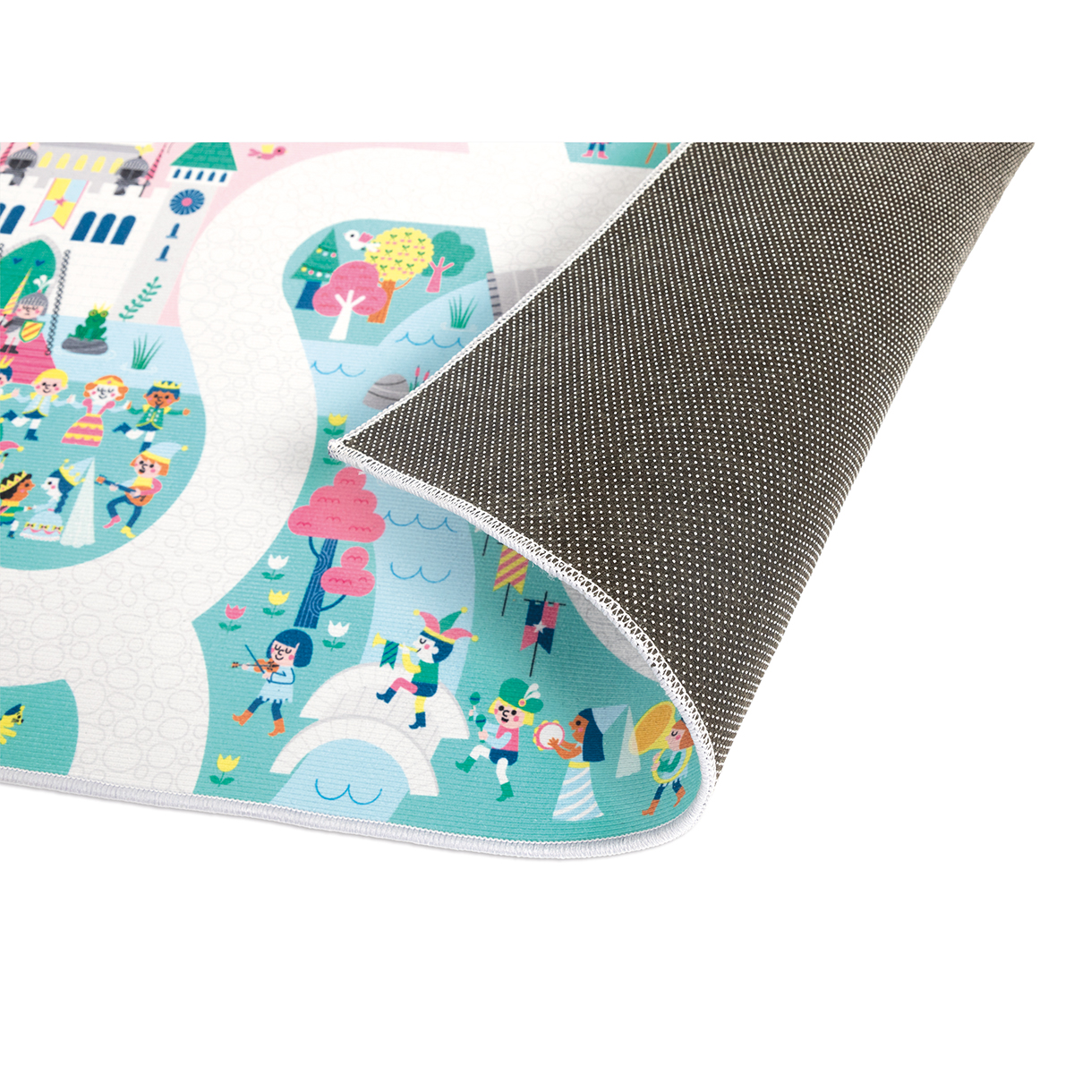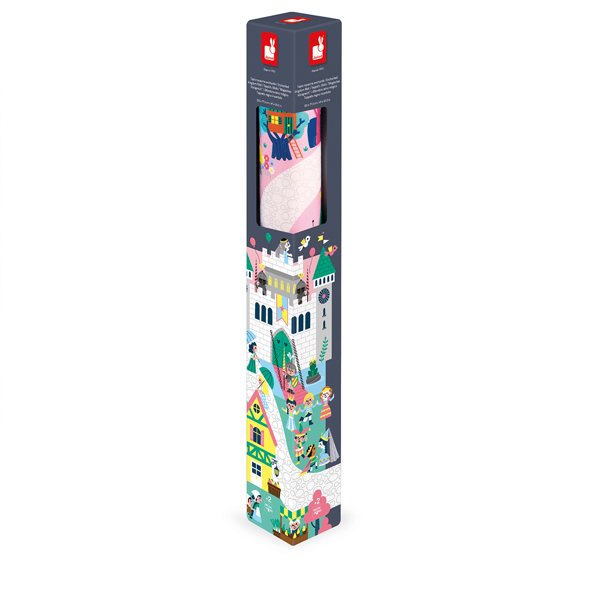 Galoppierende Einhörner in der rosa Ebene, ein Zauberer im Wald, der einen Trank zubereitet oder eine Burg, die von einem Drachen angegriffen wird: kein Zweifel, dass wir uns in einem magischen Königreich befinden! Entlang des gepflasterten Weges kann man alle Winkel dieses sagenhaften Königreichs entdecken und sich viele Geschichten ausdenken. Dieser Teppich ist ideal dazu geeignet, die Phantasie zu fördern. Außerdem ist er ein riesiges Suchbild. Findest du den Trompeter des Königs? Er ermöglicht es dem Kind, seinen Wortschatz zu den Themen, Musikinstrumente, Zahlen und Gefühlen weiterzuentwickeln. Ein weiterer Pluspunkt: Der Teppich ist rutschfest! Dies sorgt für mehr Sicherheit für Ihr Kind, wenn es mit seinen Modellautos spielt. Rollenspielzeug für Kinder ab 2 Jahren. Deinen Teppich kannst du mit vielen tollen Autos und Holzwürfeln von Janod ergänzen. Du kannst ihn auch mit den anderen Teppichen der Serie erweitern und einen riesigen Spielbereich kreieren!