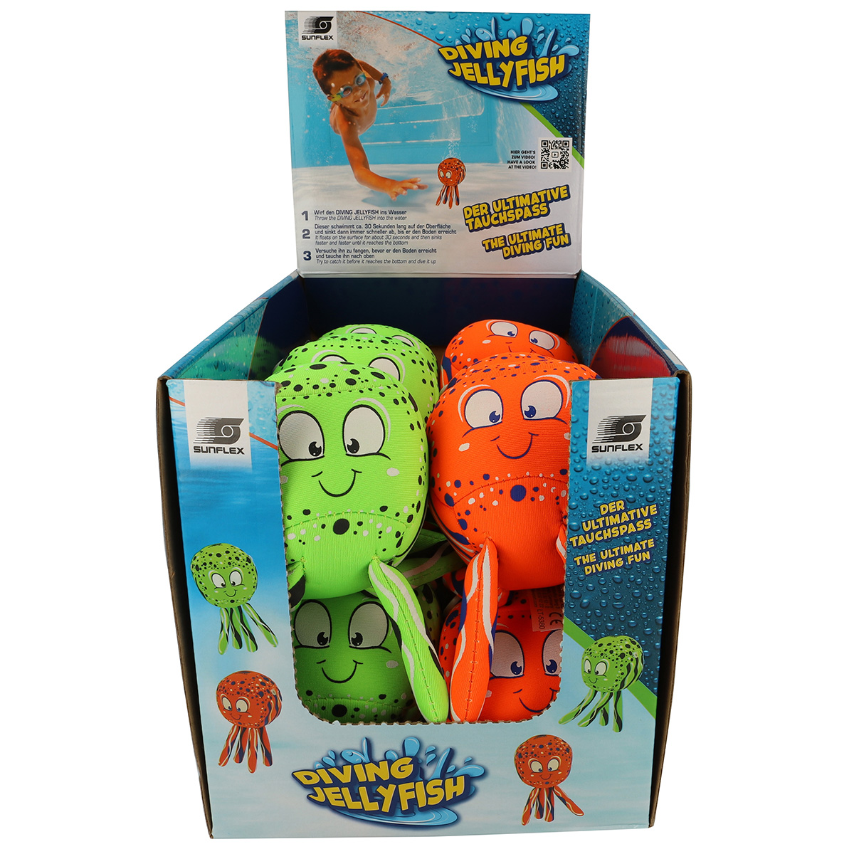 La balle descend de plus en plus vite après avoir été immergée dans l'eau. Pendant l'immersion, attrape l'article avant qu'il n'arrive au fond de la piscine. Diamètre de 9 cm. Balle avec tentacules. Remplie de mousse en haut et de sable en bas, avec des trous sur le dessus pour que la mousse puisse être remplie d'eau et recouverte de néoprène.