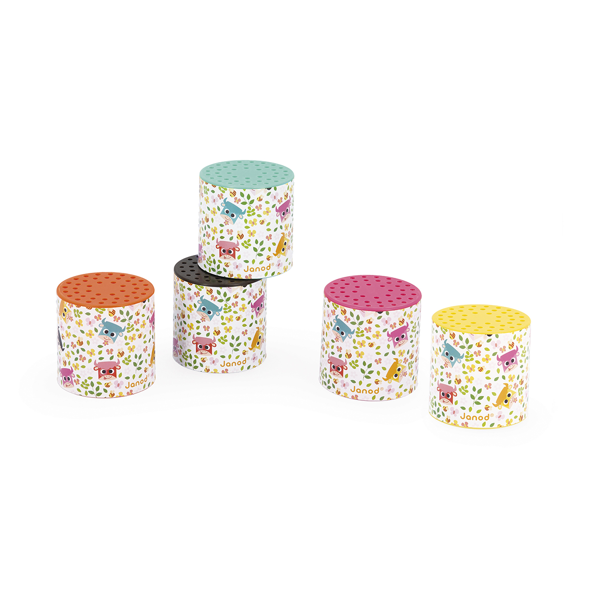 Display de 12 boites à meuh (5 couleurs assorties) : 4 boites avec le couvercle rouge, 2 jaunes, 2 bleues, 2 roses et 2 noires. Livrées en display de 12 pcs. Plastique : polystyrène