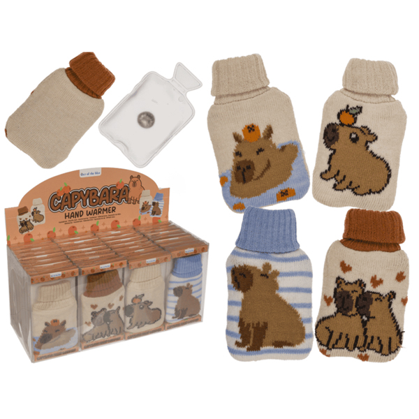 Chauffe-main, Bouillotte avec housse en tricot, Capybara, 11 cm, 4 ass., dans boîte en PET, 32 pièces dans présentoir