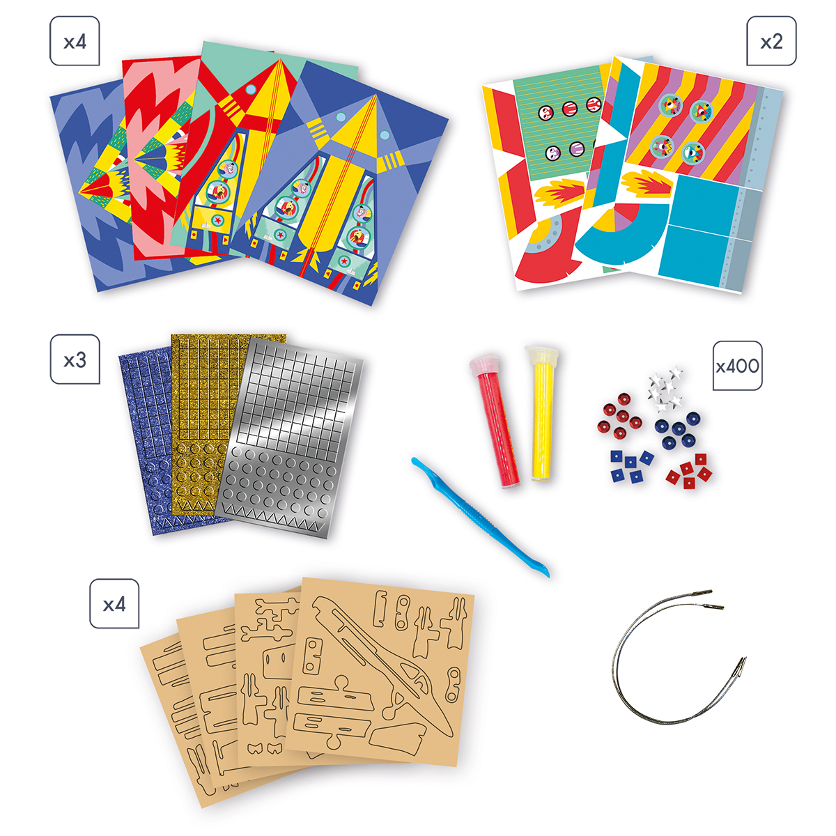 Décollage imminant ! Avec ce kit créatif multiactivités, les enfants dès 7 ans réalisent 13 créations sur le thème des aventuriers du ciel : avions, fusées, astronautes, super-héros ... Plusieurs techniques sont proposées pour des activités créatives variées ! Les plus manuels pourront réaliser 4 avions en papier, 2 fusées en papier et leur lanceur et 1 maquette d'avion. Les plus minutieux s'amuseront à décorer 2 tableaux autocollants avec des sequins, 2 tableaux avec du sable coloré et 2 masques avec des mosaïques. Un livret d'instructions est fourni, pour guider les petits créatifs pas à pas. 6 activités manuelles différentes sont proposées dans ce coffret multiactivités : pliage, collage de sequins, de mosaïques ou de sable, autocollants, maquette à assembler ... Il faudra compter 4h20min environ pour réaliser l'ensemble des créations proposées dans ce coffret. Voilà un loisir créatif riche de diverses techniques sur le thème du ciel et de l'espace ! On conserve ses jolis tableaux pour décorer sa chambre, on s'amuse à faire voler ses fusées et on se déguise avec les masques qu'on a décoré soi-même. Ce coffret créatif peut être proposé à plusieurs enfants, qui pourront prendre part à l'activité et développer leur dextérité et leur sens artistique tous ensemble. Le kit créatif multiactivités Aventuriers du ciel est issu de la collection Les Ateliers du Calme.