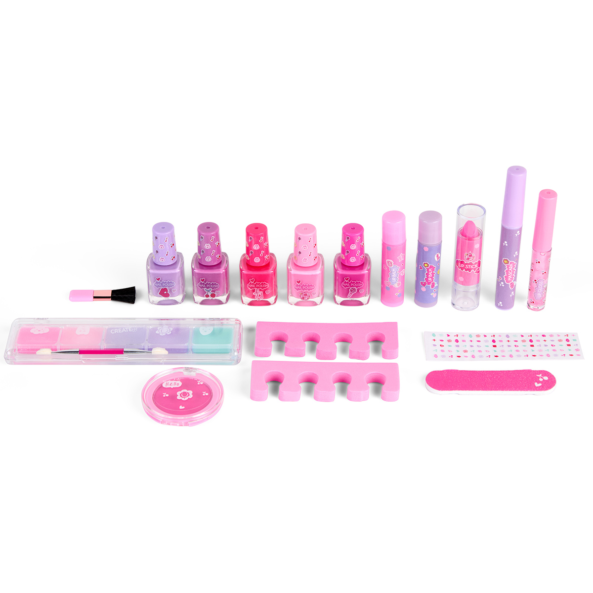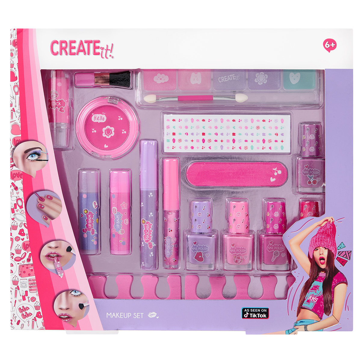 Create it! Ensemble de maquillage rempli avec des ombres à paupières, pinceau éponge, fard à joues, pinceau à fard à joues, rouge à lèvres, gloss, vernis à ongles, lime à ongles.