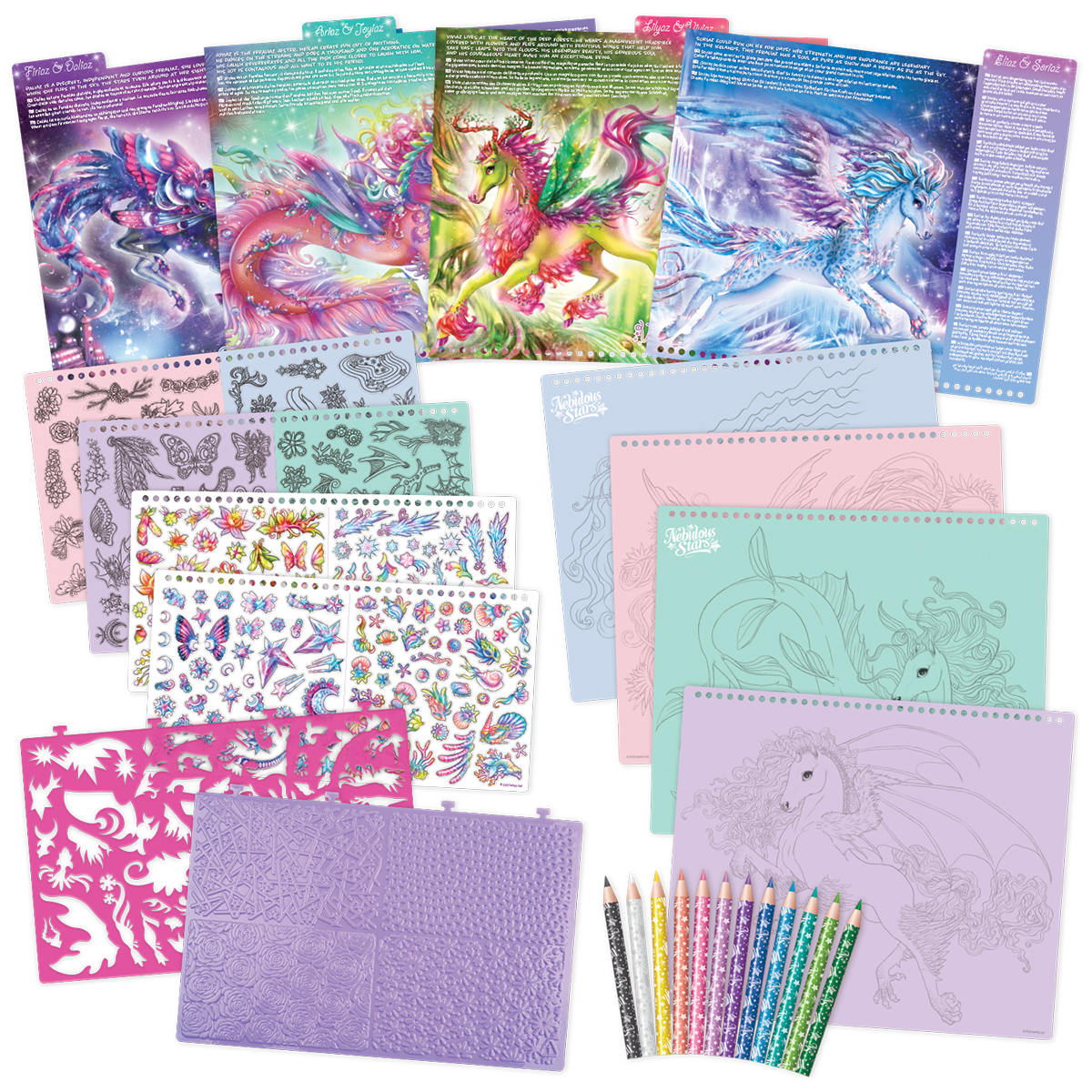 Crée de superbes chevaux magiques qui auront fière allure aux côtés des Stars. Utilise une variété de techniques de dessin, de pochoirs et d’autocollants. Contenu: 35 pages à dessiner - 80 pochoirs - Plus de 80 motifs inspirants pour pochoir - 4 motifs à frotter - autocollants - autocollants à colorier - 12 crayons de couleur - 12 techniques de dessin