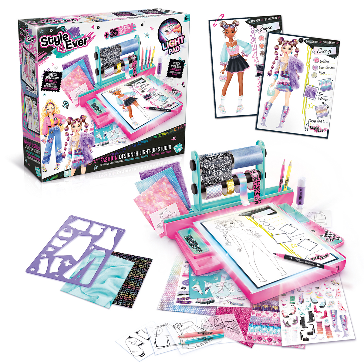 Montre ton talent de styliste et crée ta collection avec ce studio de mode lumineux ! Les accessoires inclus te permettront de réaliser facilement de nombreuses tenues. Il est équipé de tout ce dont la styliste a besoin : pochoirs, tissus, papiers imprimés, rubans...