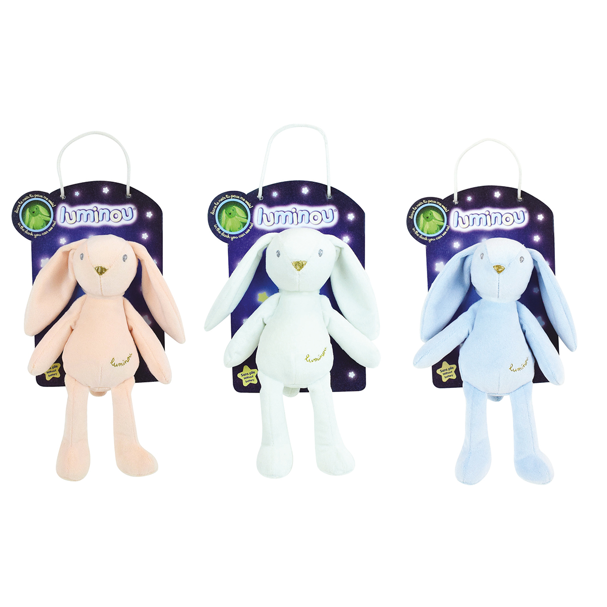 Peluches pensées pour les bébés qui s'illuminent dans le noir et s'éteignent doucement, grâce à leur tissu photoluminescent. Assortiment : 6 Blanc / 3 Pêche / 3 Bleu