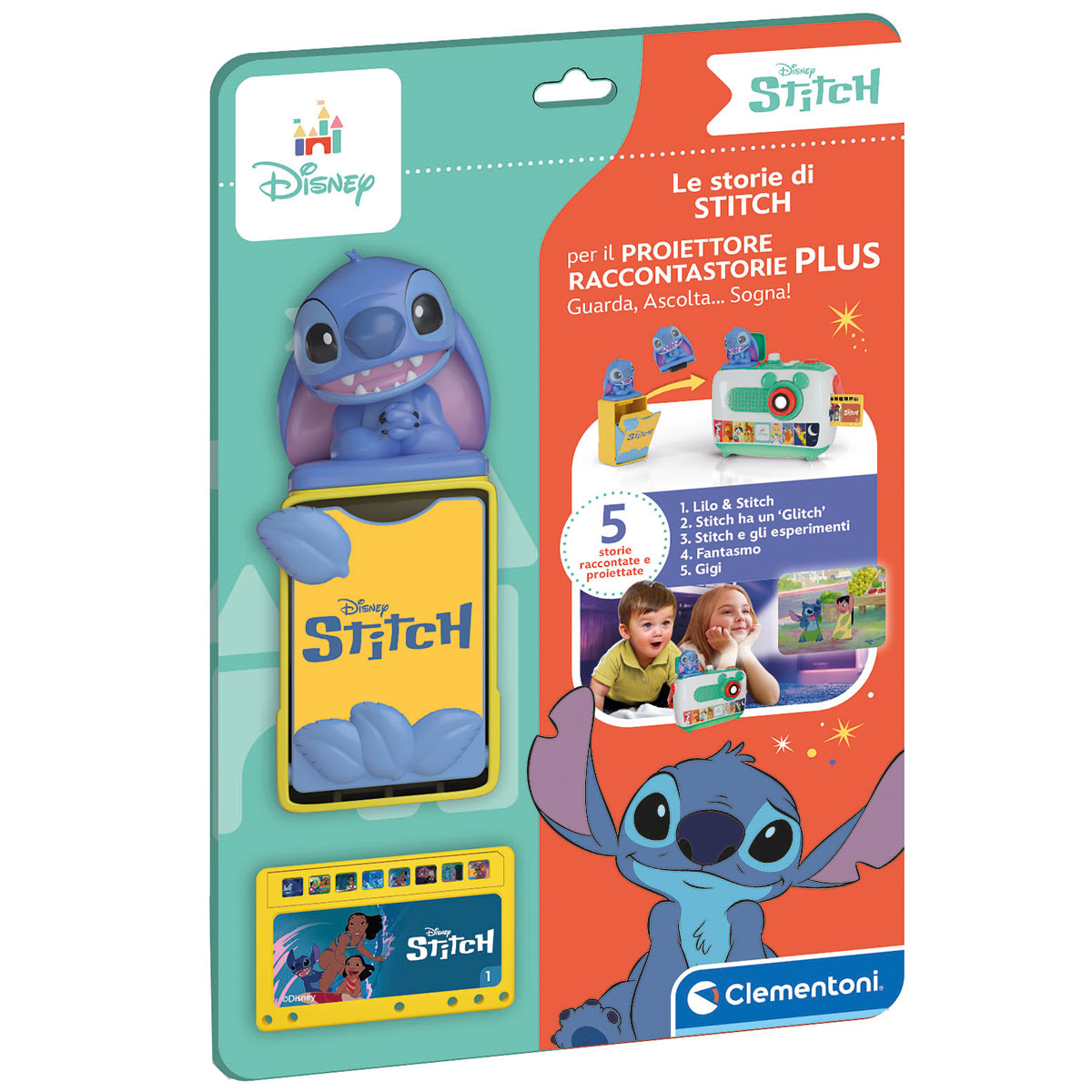 Una scatola con storie aggiuntive per il proiettore Disney PLUS. Contiene 5 schede con storie divertenti e una piccola statuina da agganciare al proiettore per godersi i contenuti aggiuntivi. Ogni scheda proietta 8 diapositive con immagini originali dei cartoni animati Disney. Una volta ascoltata la storia, riponi la scheda nell'apposita scatolina, cambia personaggio e ricomincia. Colleziona tutti i personaggi!