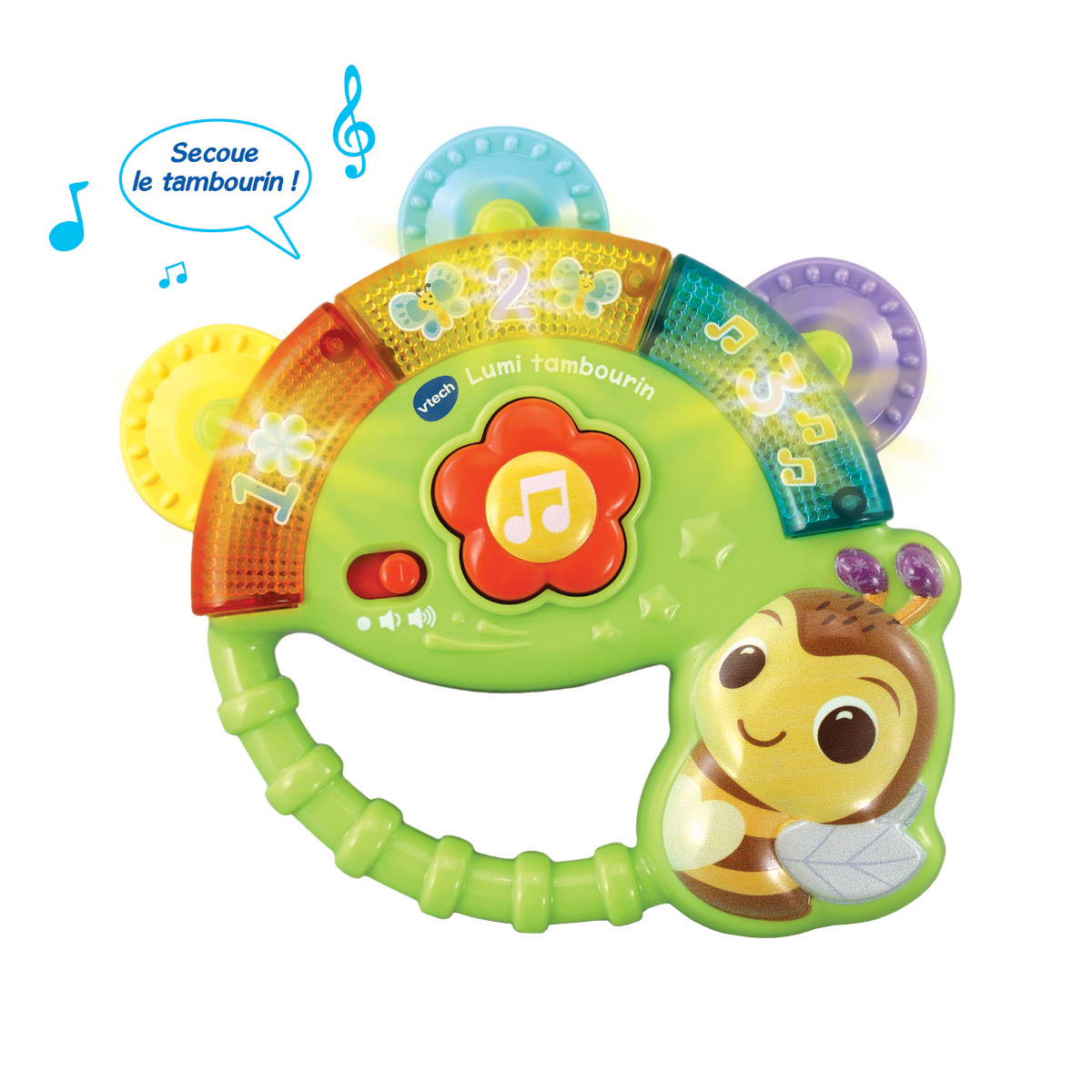 Secouer et chanter avec l'abeille musicale! Tambour adapté à l'âge avec capteur de mouvement, couleurs lumineuses, lumières clignotantes et super éléments à faire tinter. Développe les compétences motrices. Le bouton fleur déclenche des chansons et énonce les chiffres. Le capteur de mouvement intégré déclenche différents sons et mélodies lorsqu'on secoue. 3 chansons chantées et 10 mélodies. Compartiment à piles sécurisé pour les enfants, arrêt automatique et réglage du volume.
