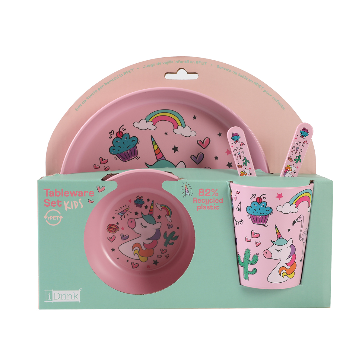 Nouveau set en rpet. Conçu pour les déjeuners des enfants, ce set comprend un verre de 200 ml, un bol de 280 ml, une assiette et des couverts (cuillère et fourchette), le tout fabriqué en plastique rpet recyclé.