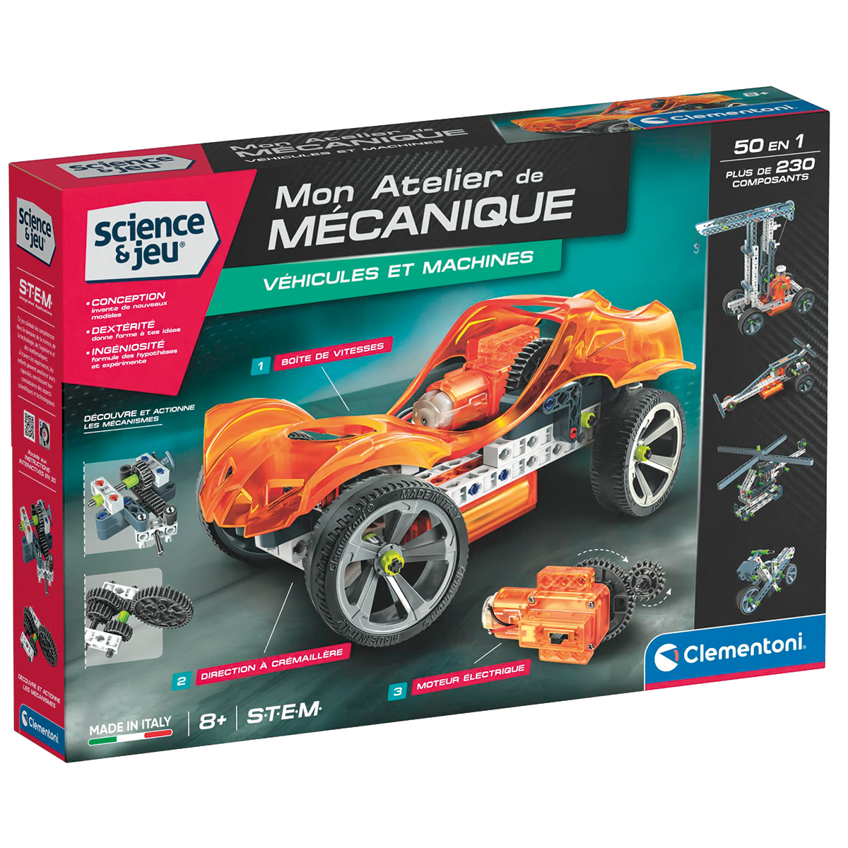 Un atelier de mécanique incroyable pour enseigner aux enfants les principes fondamentaux de la mécanique et de l'ingénierie. Grâce à plus de 230 composants, il est possible de réaliser plus de 50 constructions de difficulté variable. Cette boîte permet notamment de construire un monte-charge, un hélicoptère ou encore une voiture, équipée d'un moteur électrique, d'un système de direction et de 2 vitesses. Les 3 manuels scientifiques illustrés guident l'enfant pas à pas pour chaque construction afin qu'il évolue en autonomie et en toute sécurité. Le design, le concept, le développement et la fabrication sont intégralement réalisés en Italie.