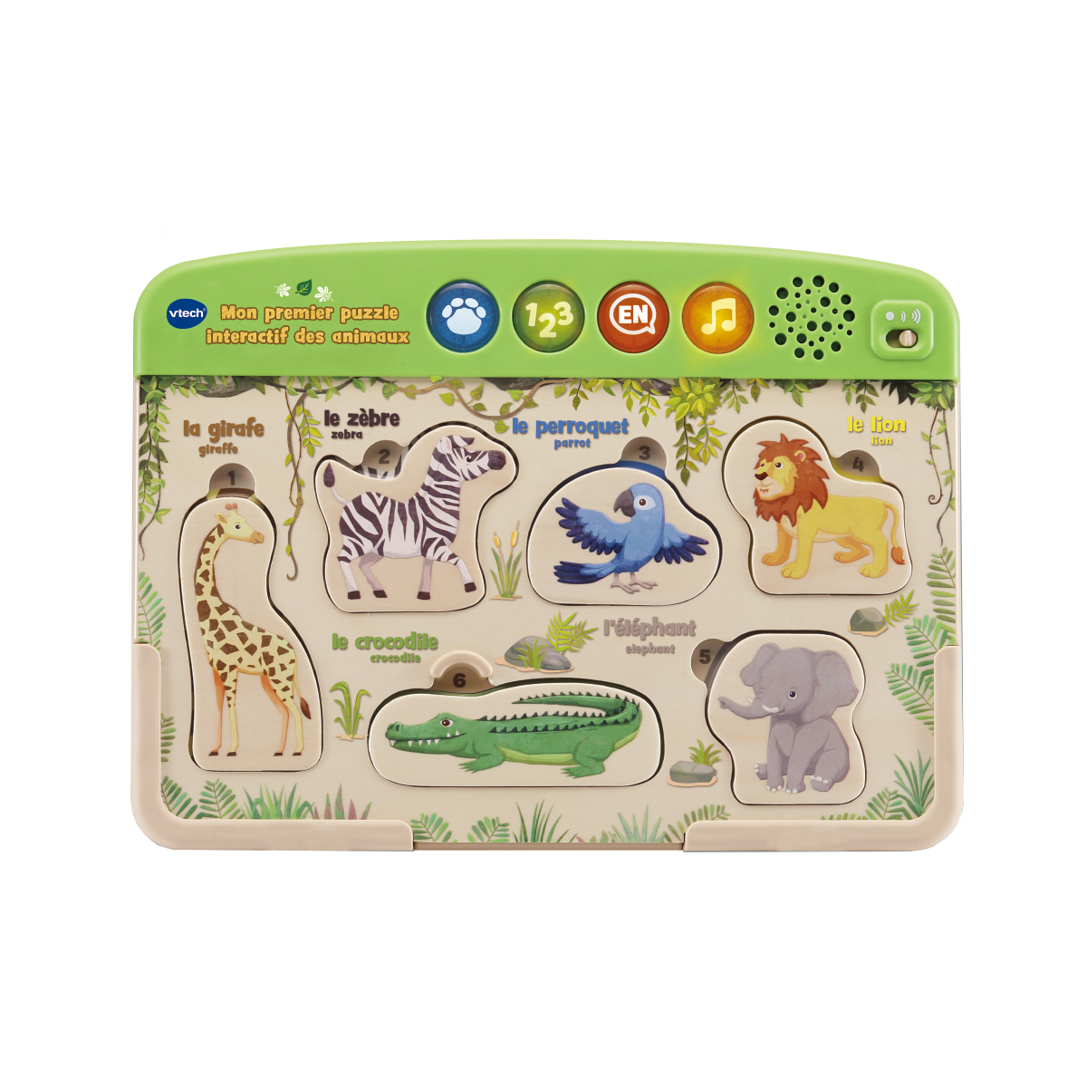 Avec le puzzle interactif en bois sur les animaux fabriqué à partir de matériaux durables, les enfants découvrent les animaux et leurs habitats! Avec ce puzzle en bois interactif, les enfants développent leur motricité fine, apprennent à connaître les animaux et leurs habitats, et apprennent en passant leurs premiers mots en anglais. 4 modes de jeu: apprentissage, jeu de recherche, mode anglais et musique. Illustrations des habitats des animaux dans les encoches pour les pièces du puzzle. Il reconnaît lorsque les pièces du puzzle sont correctement placées, énonce le nom de l'animal, son habitat, les chiffres représentés et joue les sons des animaux. Avec 6 pièces de puzzle.