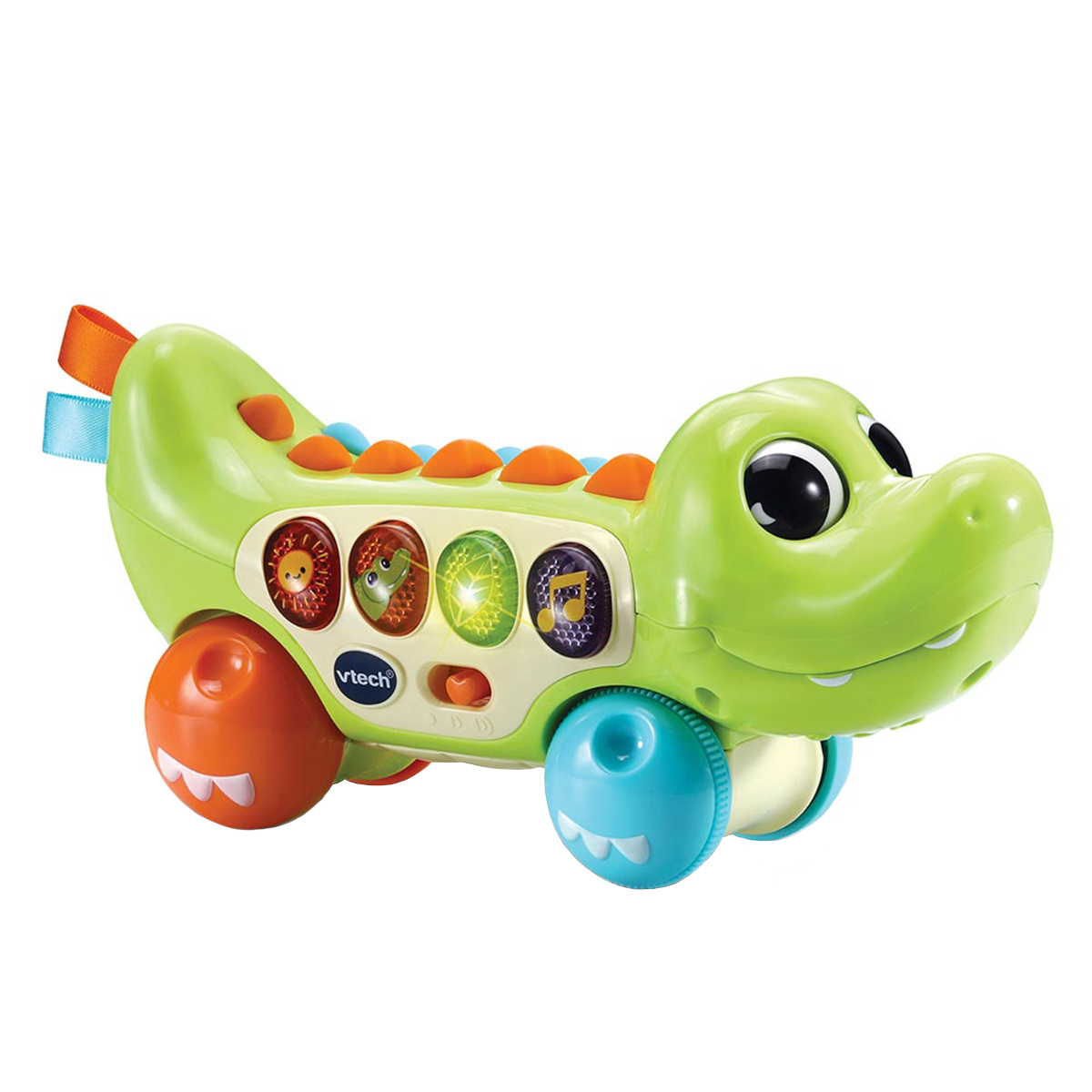 Plaisir d'apprentissage avec le crocodile malin! Crocodile coloré sur roulettes avec plusieurs boutons. 4 boutons colorés avec différents symboles déclenchent des chansons, des bruits de la nature, des phrases et des mélodies: bouton rouge soleil pour les chansons, bouton crocodile jaune pour les phrases, bouton feuille verte pour les bruits de la nature et bouton musique violet pour les mélodies. Le capteur de mouvement intégré détecte lorsque le crocodile est poussé ou déplacé et déclenche alors des sons, des phrases et des chansons. Lorsque le crocodile est déplacé, ses yeux bougent. Le peigne sur le dos du crocodile est fait de plastique souple. 3 chansons chantées et 10 mélodies. Compartiment à piles sécurisé pour les enfants, arrêt automatique et réglage du volume.