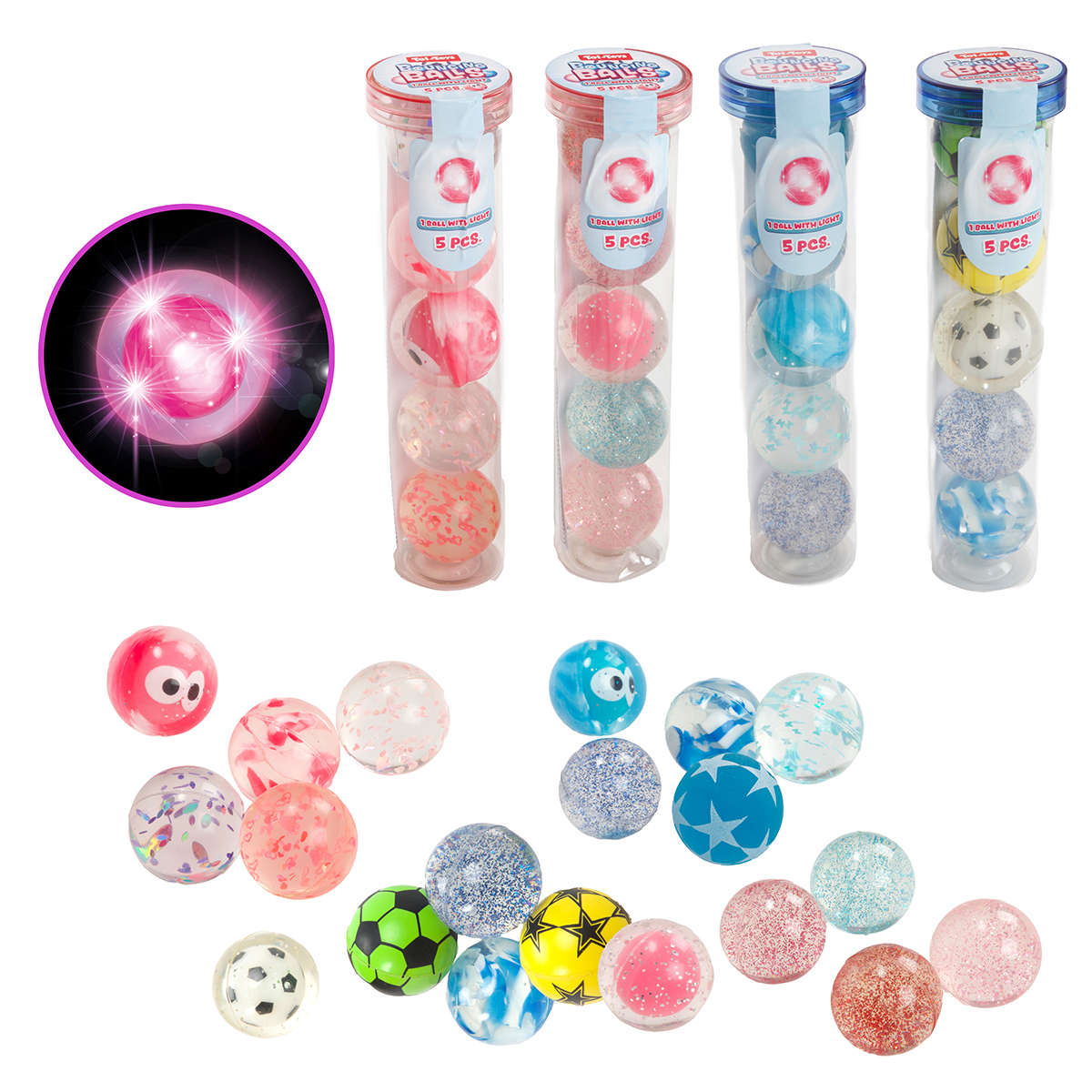 Balles à sauter avec lumière ave 5 pièces, 4-fois assortis.