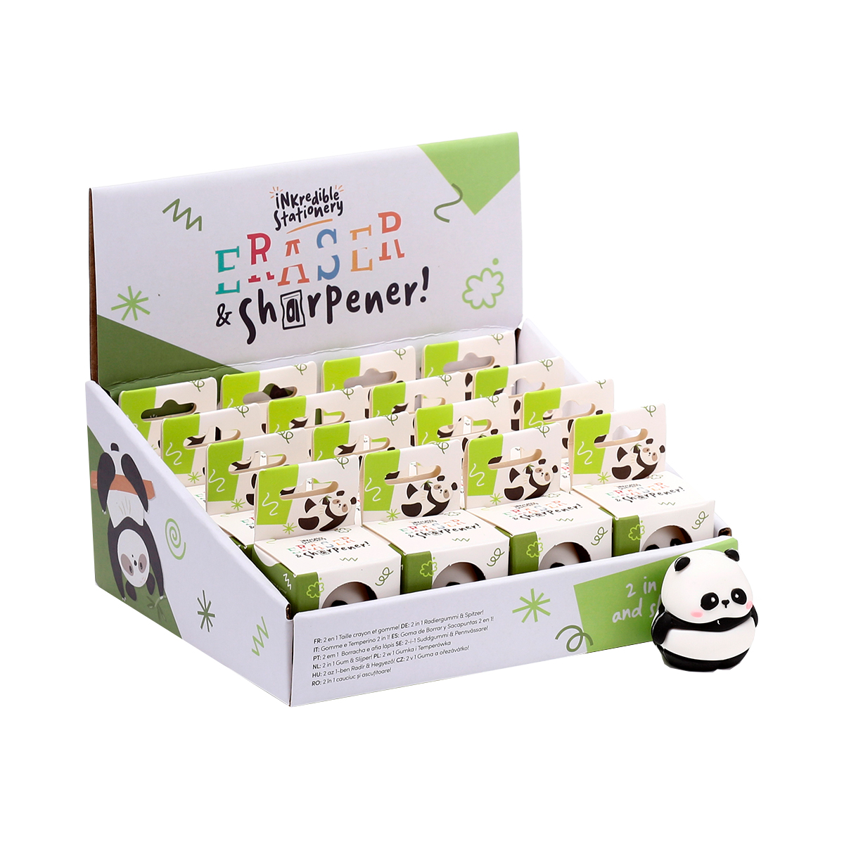 Taille-crayon panda assortis en display à 16 pièces