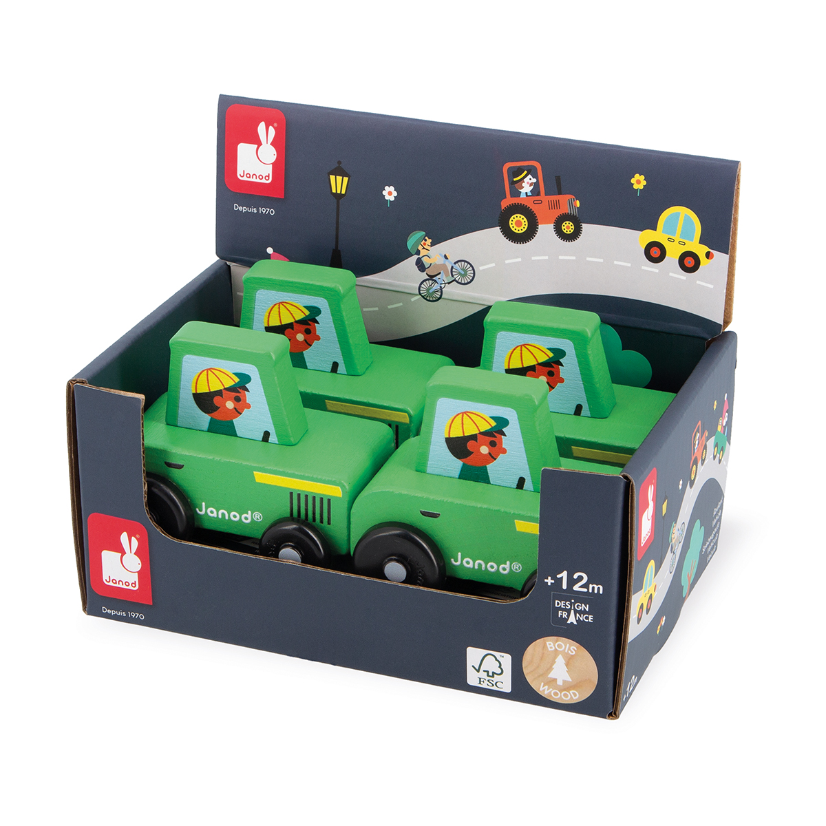 Le fermier est dans son tracteur il part récupérér les bottes de pailles dans le pré. Imaginez de grandes histoires à la ferme avec ce tracteur en bois. Grâce à sa forme, le tracteur est facile à prendre en main pour les tout petits. Jouet en bois, pour les enfants à partir de 12 mois. Associé à ton tapis et au joli coffret de cube de la gamme Janod, ce roulant complète parfaitement ton univers.