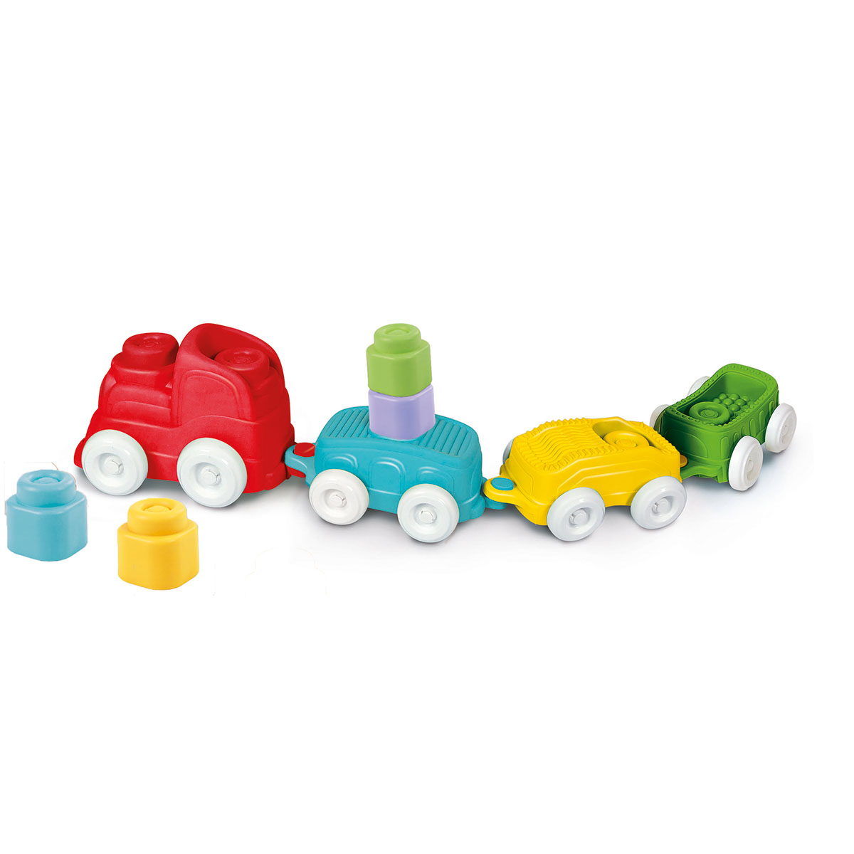 Train sensoriel Clemmy. Un train avec la locomotive et ses wagons avec lesquels les enfants peuvent jouer et explorer. Les enfants peuvent découvrir les surfaces en relief, les différentes formes et ressentir la douceur du matériau Clemmy, tout en profitant d'une expérience sensorielle qui leur permettra de perfectionner leur sens du toucher et leurs compétences manuelles. Contient de nombreuses briques souples colorées à insérer dans la locomotive et les wagons, ou à empiler, pour créer des tours à renverser puis à reconstruire encore et encore.