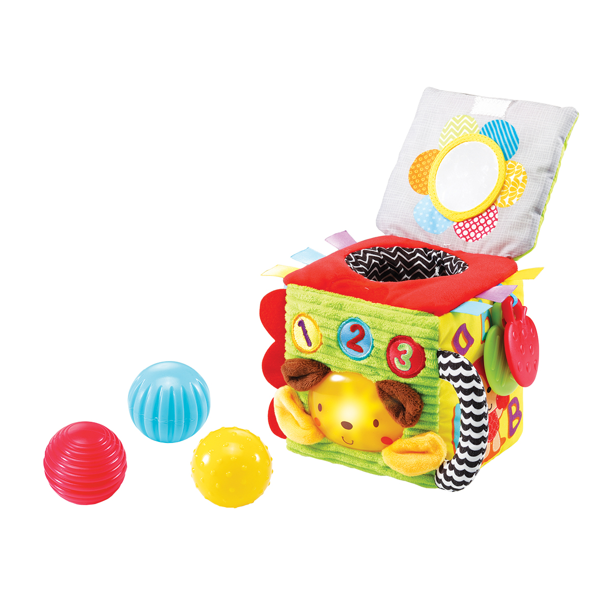 Un cube tout doux et interactif. Bébé développe son sens du toucher en jouant avec les 6 faces du cube. 3 boutons pour découvrir les couleurs, les formes, les chiffres et bien plus encore. Le visage du chiot s'illumine au rythme des mélodies. Différentes textures et des éléments à manipuler pour développer la motricité fine de bébé. Trois balles de jeu aux différents matières incluses. Plus de 40 chansons, mélodies, sons et phrases.