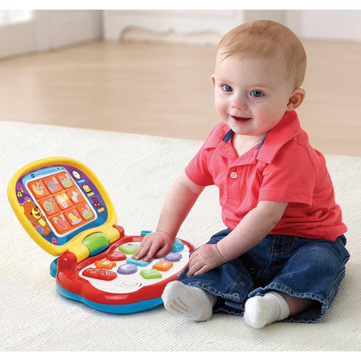 Un super ordinateur lumineux pour imiter les grands. 9 touches interactives pour découvrir les formes, les animaux et les couleurs. Avec une souris directionnelle pour imiter Papa et Maman, déclencher des sons rigolos et découvrir les chiffres. Des effets lumineux à l'écran attirent l'oeil de bébé, l'incitent à jouer et font comprendre les associations. 3 modes de jeu: Animaux, Formes et Musique. Une touche pour découvrir l'alphabet en chanson. Avec une poignée pour transporter l'ordi partout. 20 mélodies et 3 chansons.
